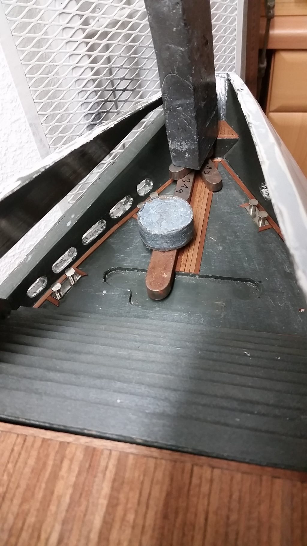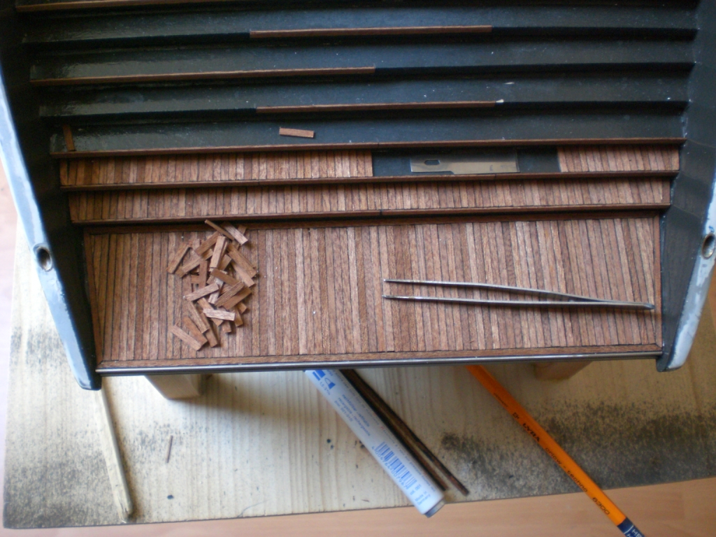 Den Boden habe ich erst angepasst, mit Mahagoni belegt und dann eingeklebt. Da wäre sonst kein Rankommen mehr gewesen.