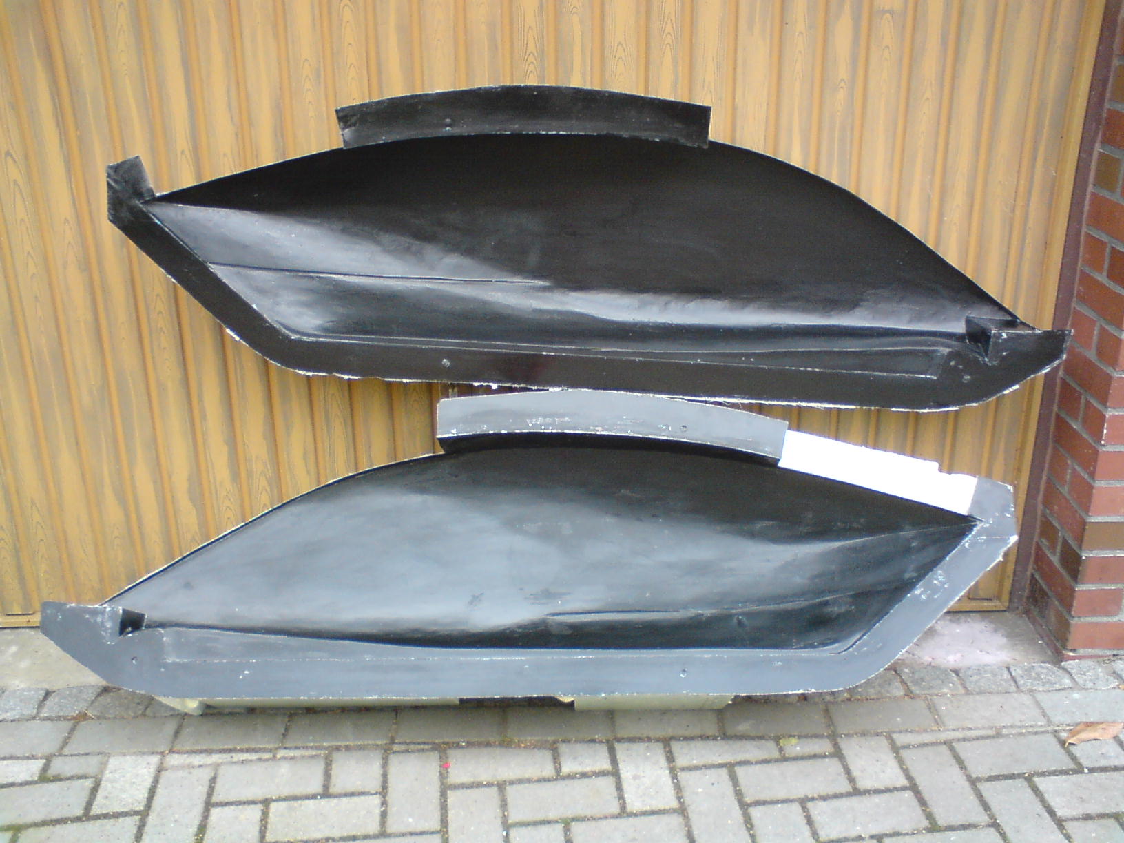 Das Gleiche habe ich nun noch einmal gemacht, nur mit dem Unterschied das ich mir die Trennebene ja nun durch den anderen Formenrand selbst geschaffen hatte. Also Trennmittel auftragen und Loslaminieren. Das Ergebnis überzeugte ebenfalls (Bild 2 unten).