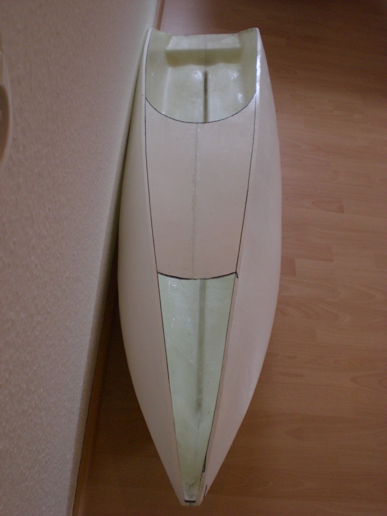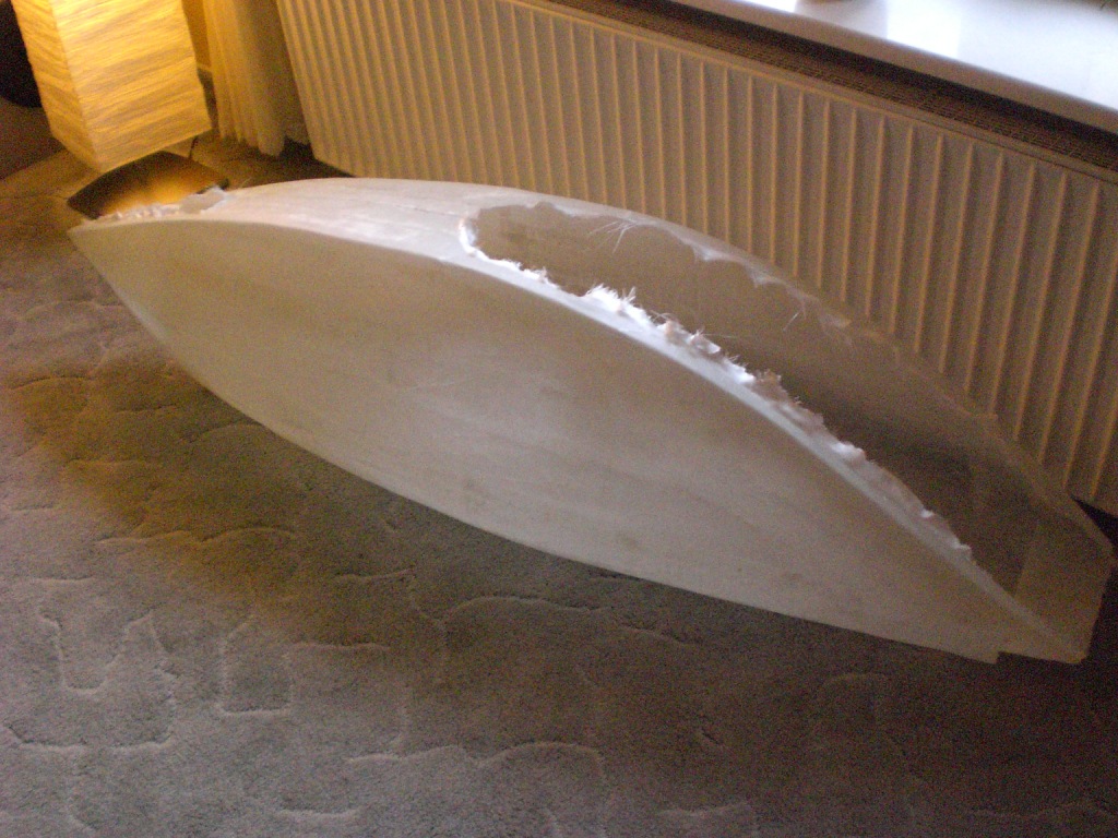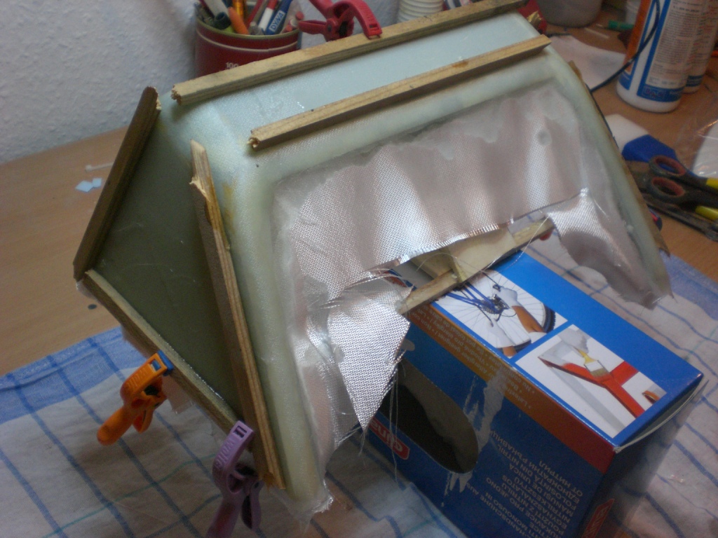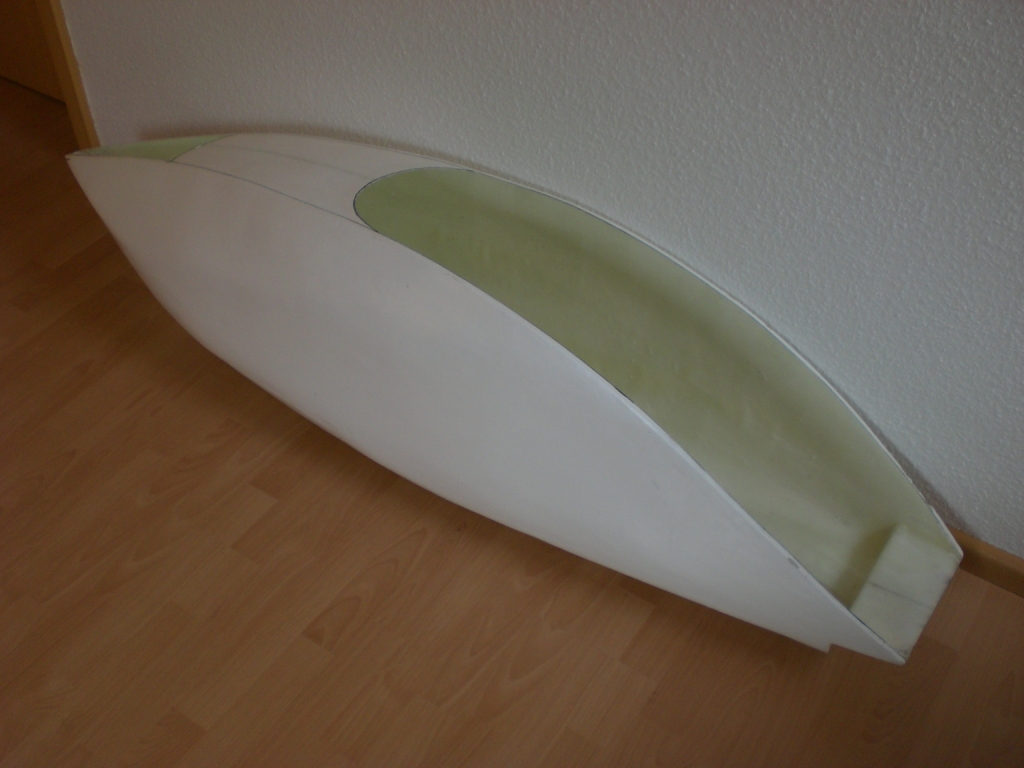 Das Laminieren des eigentlichen Rumpfes habe ich aber im ersten Anlauf verhauen. Das Harz-Härter Verhältnis stimmte bei einer Lage nicht, da mir mittendrin die Waage ausgefallen war.