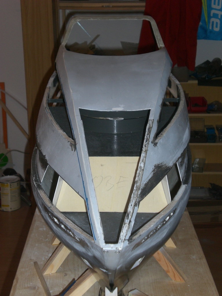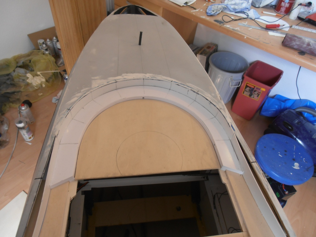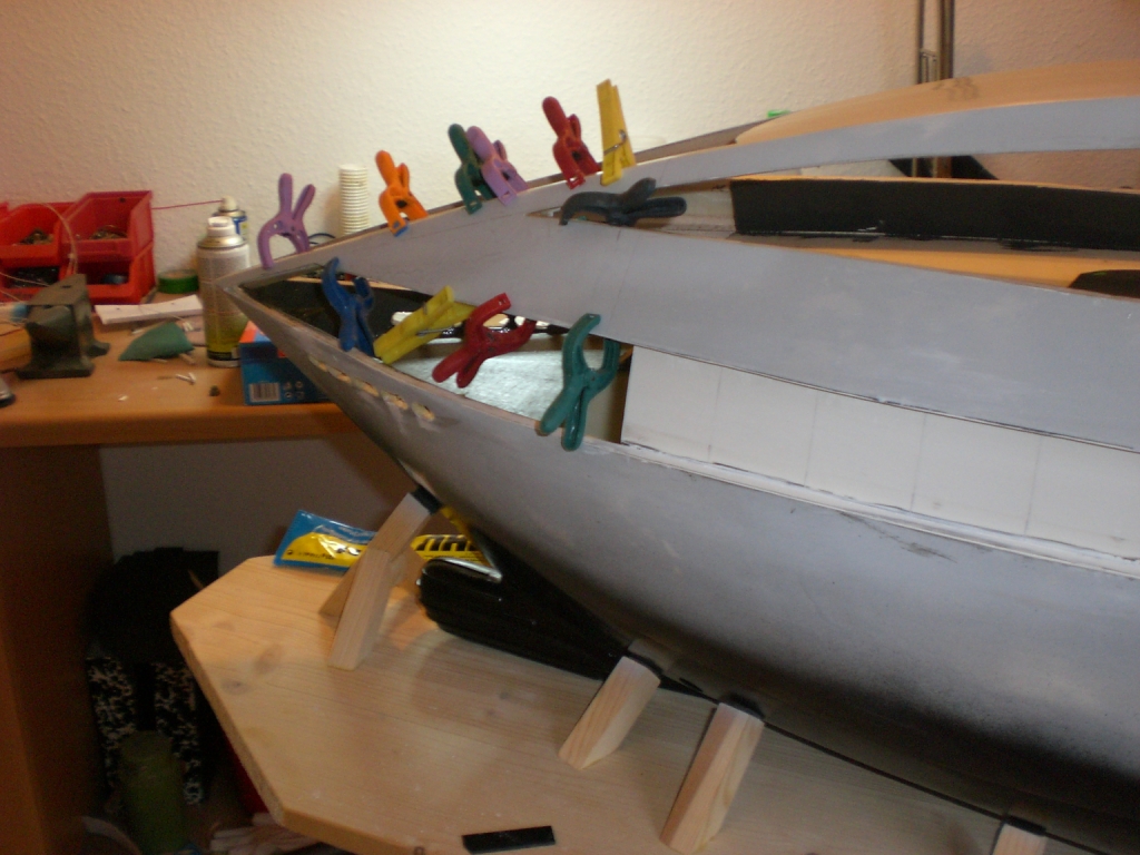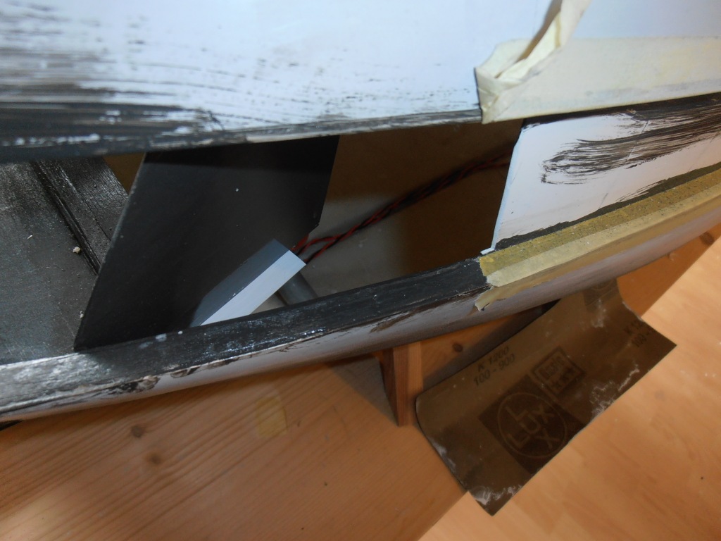 Die zwischen Rumpf und Querstraler entstanden Spalte, in die der Kleber nicht so recht hinkam. Hier habe ich mit Aceton-Schleifstaub-Paste verspachtelt. Eigentlich musste ich nur mit einem Pinsel das Aceton in die Ritzen träufeln und mit dem Schleifstaub vermengen. Ging echt gut.