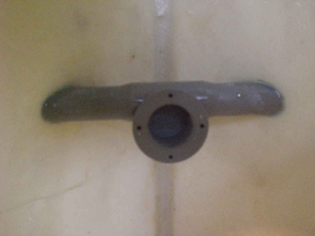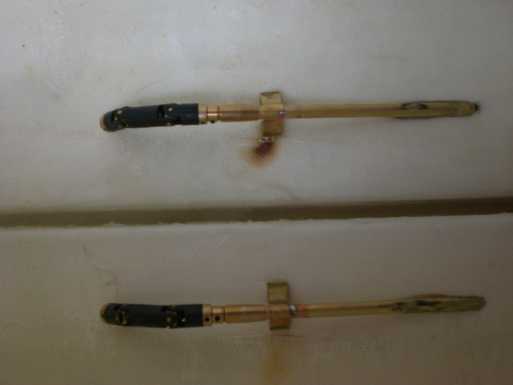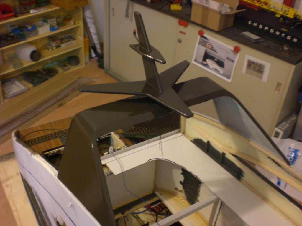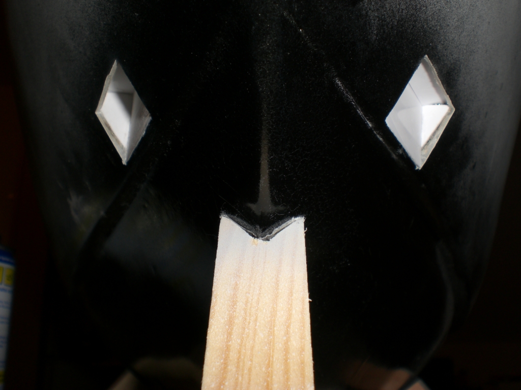 Die zwischen Rumpf und Querstraler entstanden Spalte, in die der Kleber nicht so recht hinkam. Hier habe ich mit Aceton-Schleifstaub-Paste verspachtelt. Eigentlich musste ich nur mit einem Pinsel das Aceton in die Ritzen träufeln und mit dem Schleifstaub vermengen. Ging echt gut.