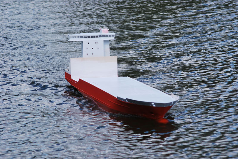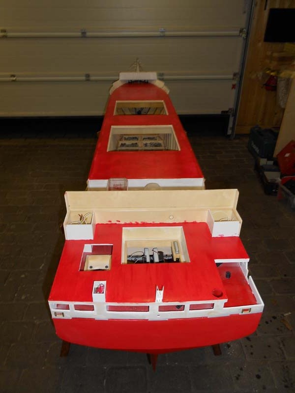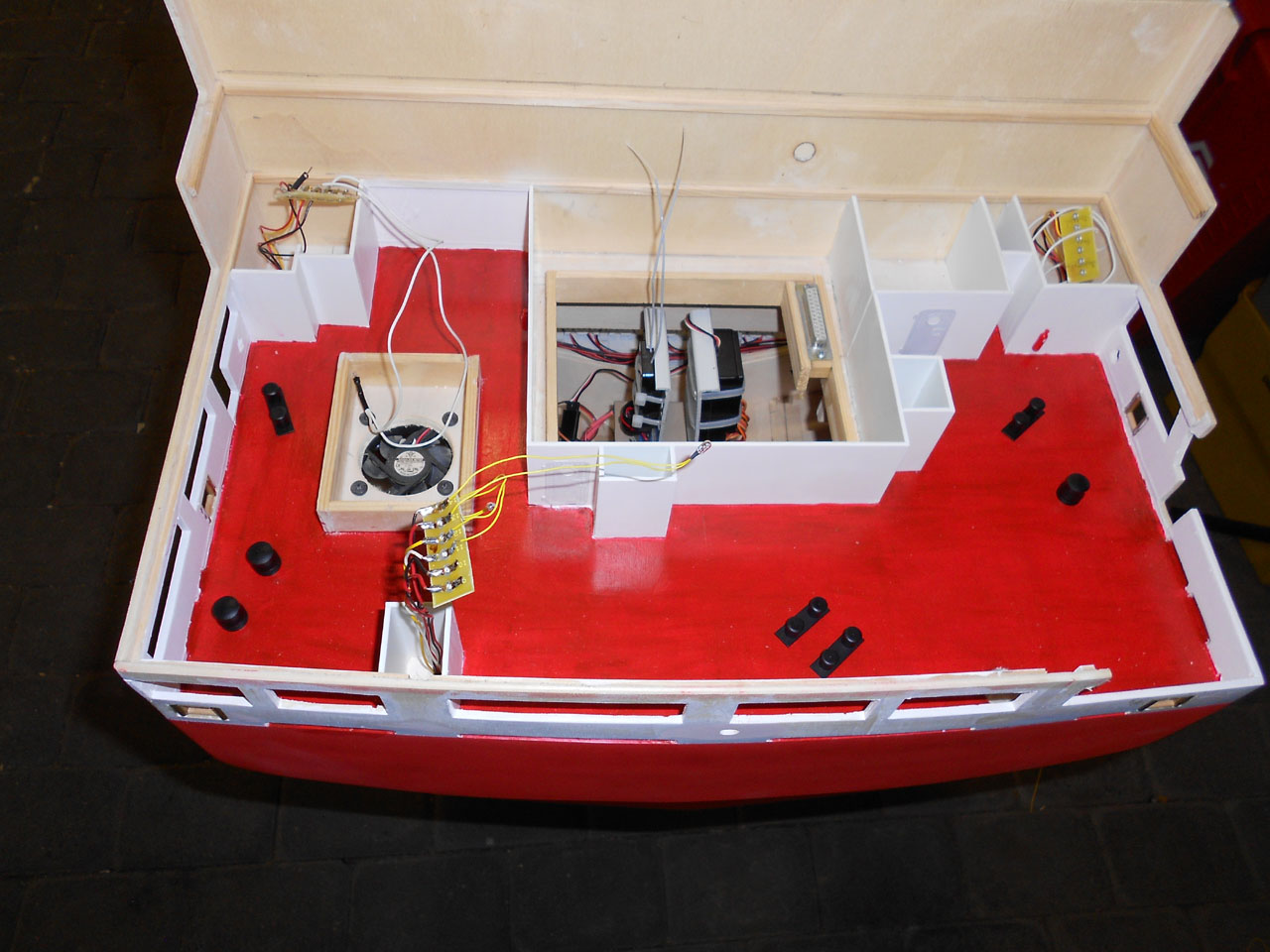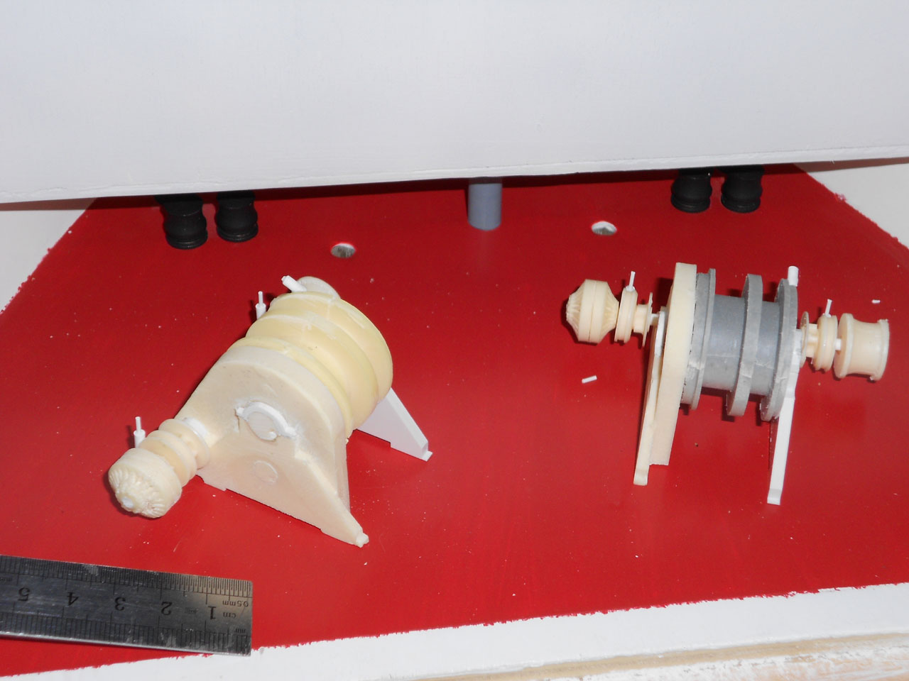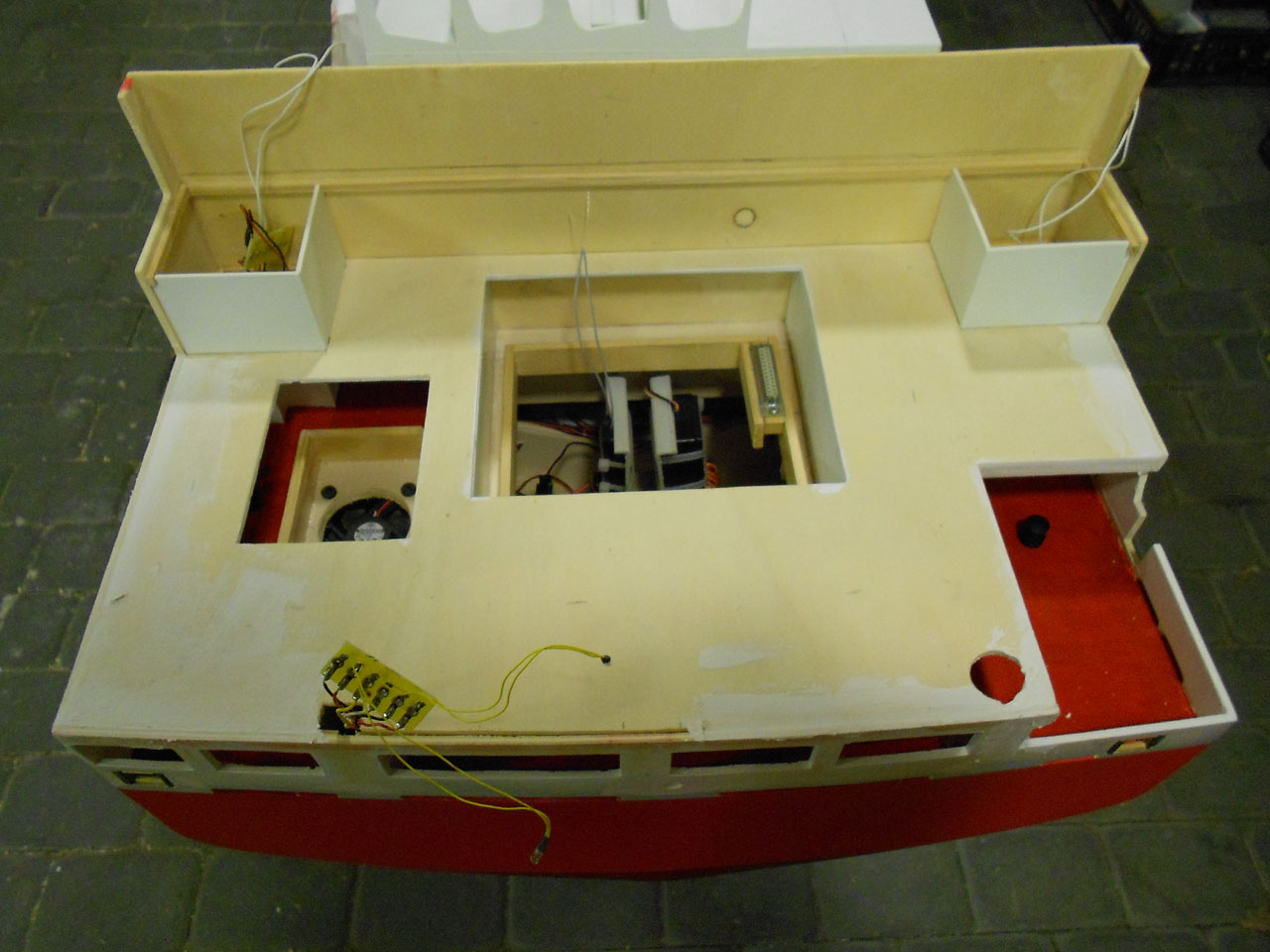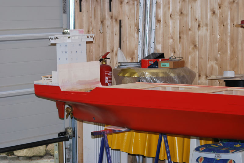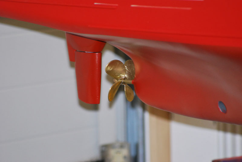 Jetzt wo die Farbe ausgehärtet ist haben wir die Querstrahlruder, das Ruder und den Propeller montiert. Als I tüpfelchen stellten wir den Aufbau mal da zu.