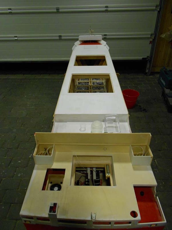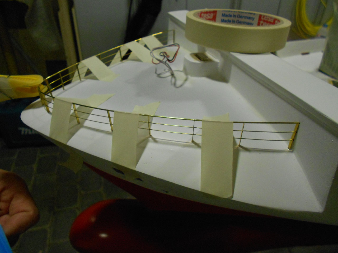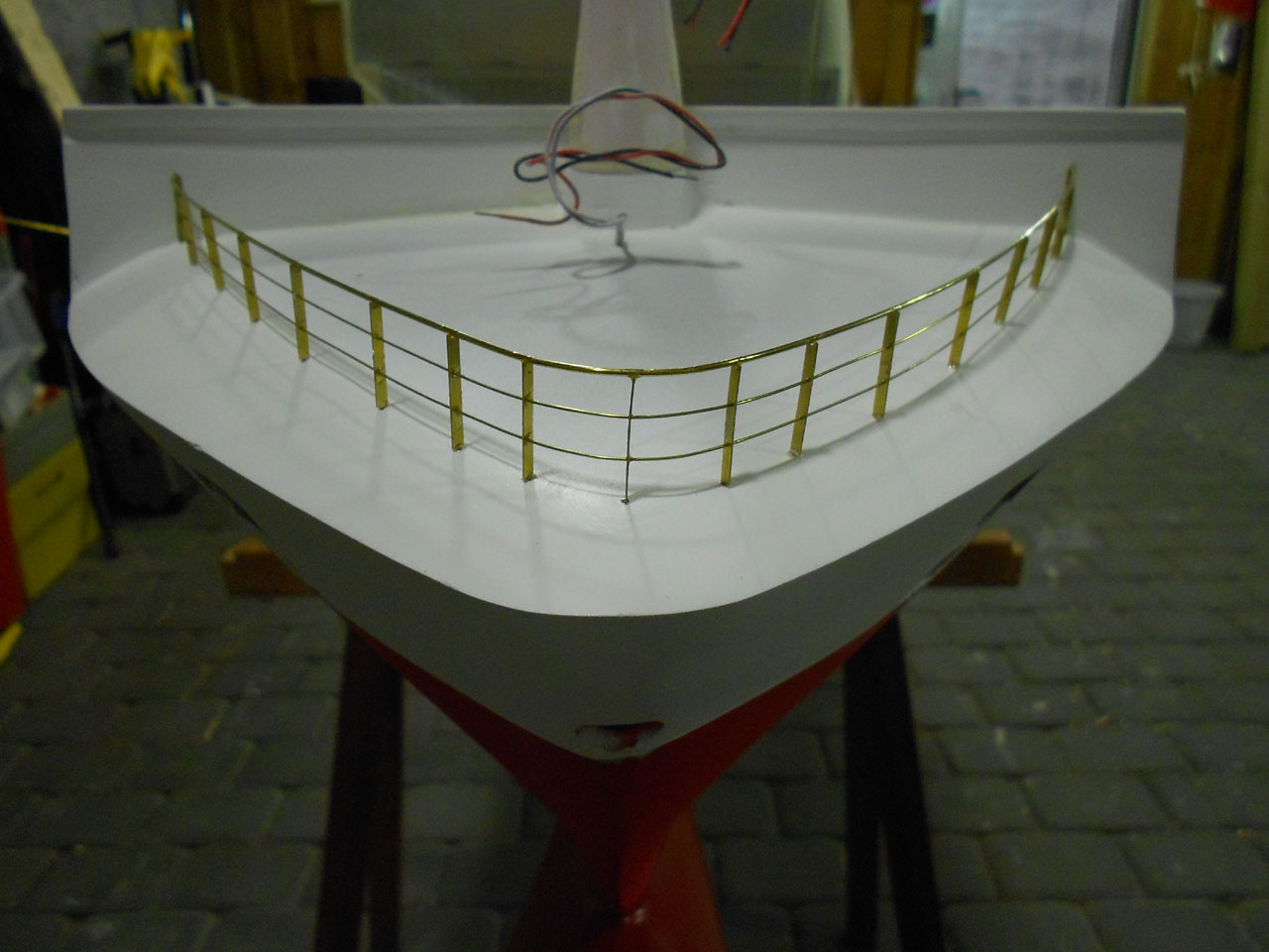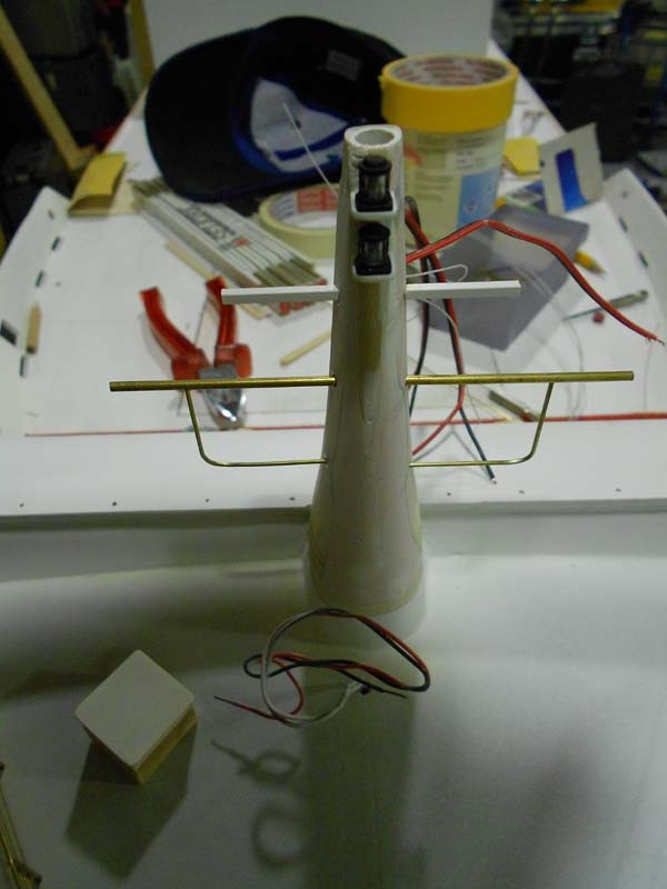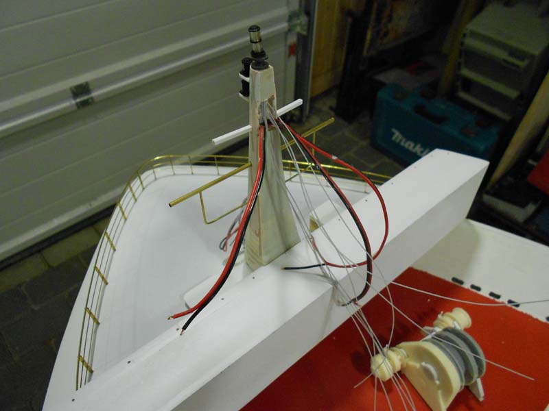 ..der Mast am Bug nimmt auch langsam Form an. Die Glühbirnen der Posi- und Ankerbeleuchtung sind schon drin. Was jetzt noch folgt sind die vier grossen Deckstrahler. Aber bis die montiert werden muss ich erstmal das ganze Kabelgewirr verstauen.