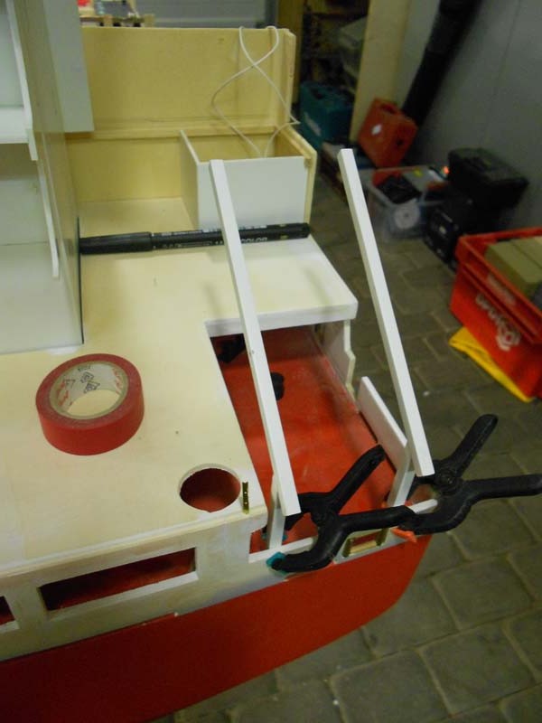 Die letzten Leisten am Heck haben wir angeklebt. Das Heckteil wurde