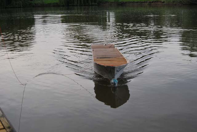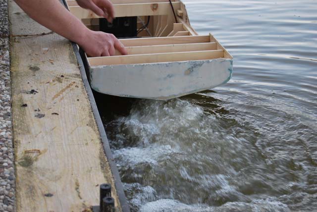 In etwa die Wasserlinie angepeilt ging es das Erstemal los. Motor an und die „Schaufel“ wirbelte das Wasser mächtig durch. Ein enormer Wasserstrudel entstand am Heck des Modells.