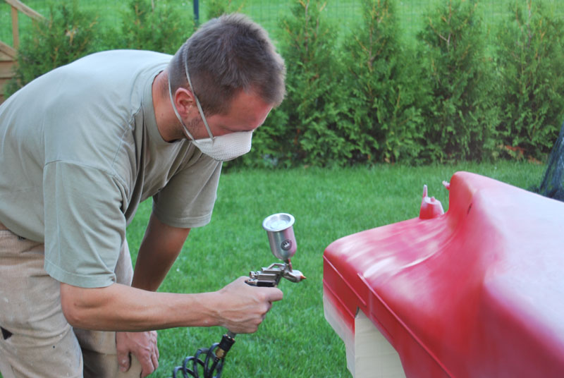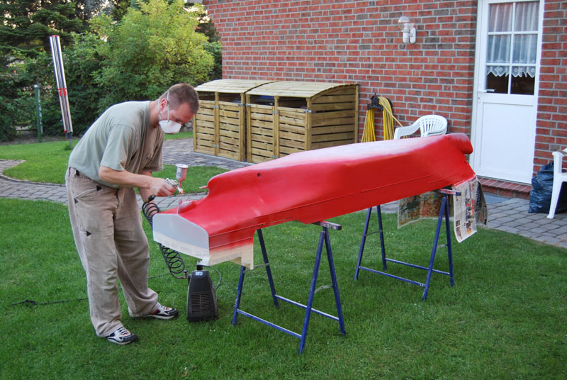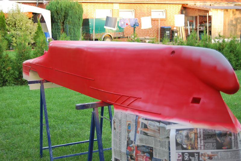 Nachdem nun der Harz gut durchgetrocknet war, haben wir den Rumpf mit Haftgrund eingestrichen. Dieses hatte den Vorteil das man nach dem Schleifen die Unebenheiten besser sehen kann.