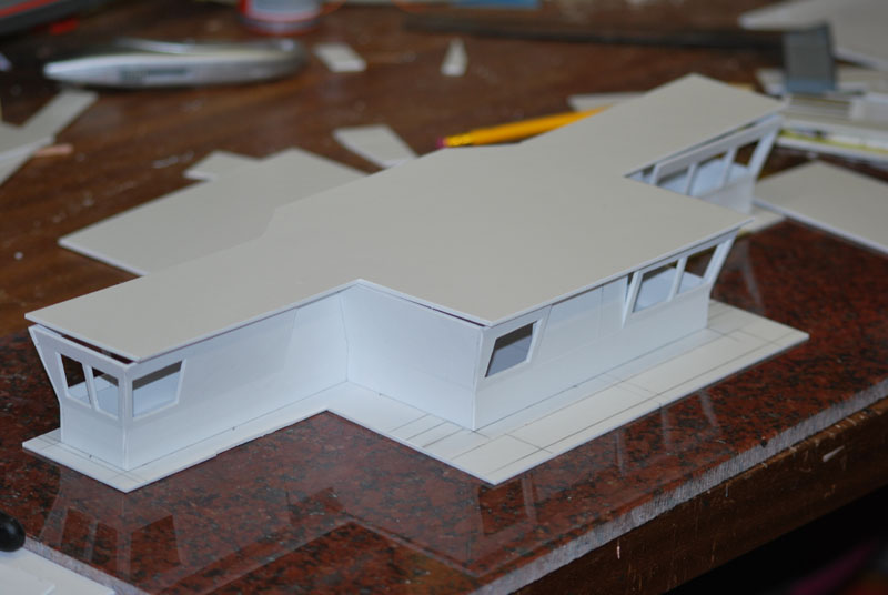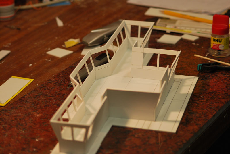 Weiter ging es mit der Brücke. Diese schnitten wir aus ABS aus und verklebten sie mit UHU Plast. Die Fenster vom gesammten Aufbau haben wir mit vereinten Kräften ausgeschnitten und ausgefeilt.