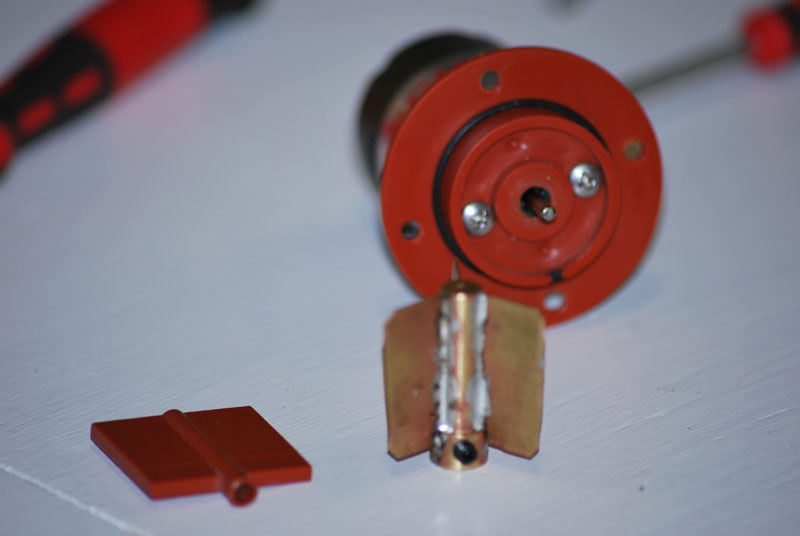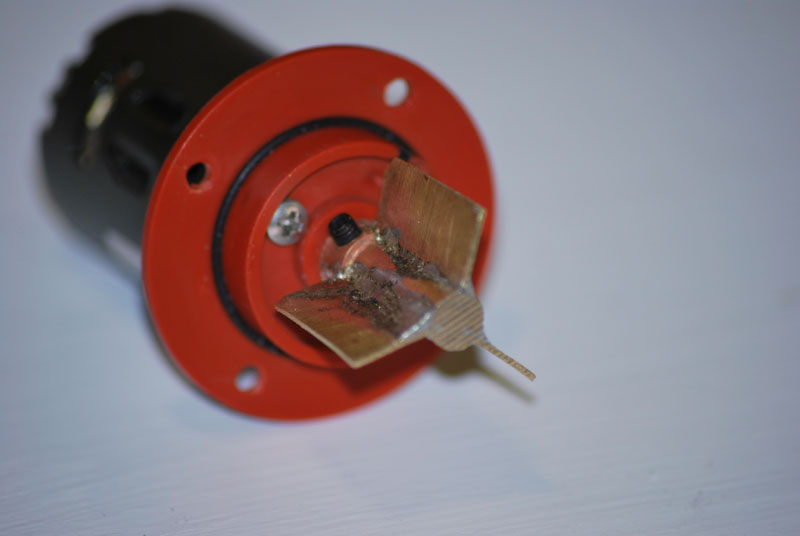 Kurzerhand haben wir die Platikblätter, die nur auf die Motorwelle gesteckt wurden, entsorgt und neue aus Messing mit Madenschraube gebastelt.