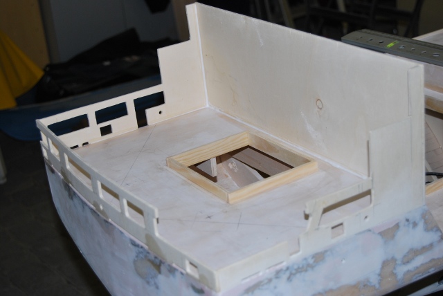 Nun ging es dem Deck an den Kragen. Im Heckbereich haben wir die Platten eingepasst und eingeleimt. Den Ausschnitt vom Steuerhaus und unsere Reparaturöffnung zum Antrieb eingesägt.