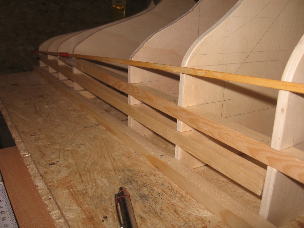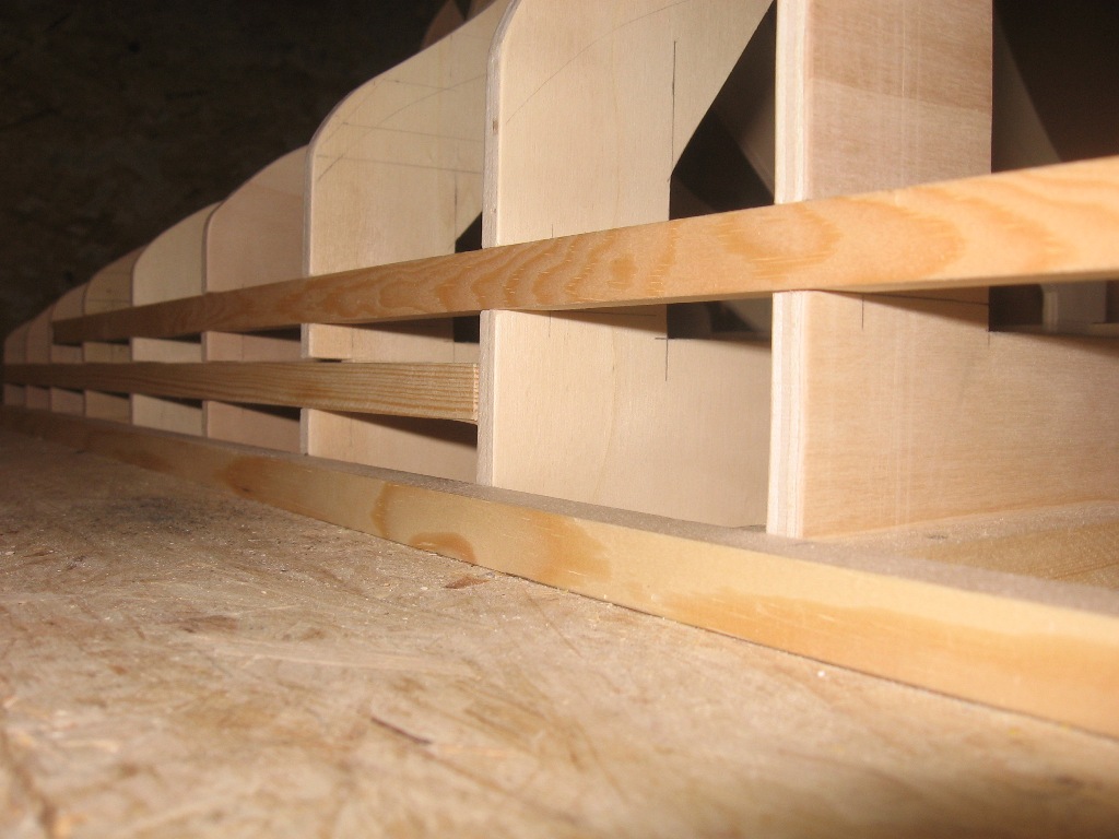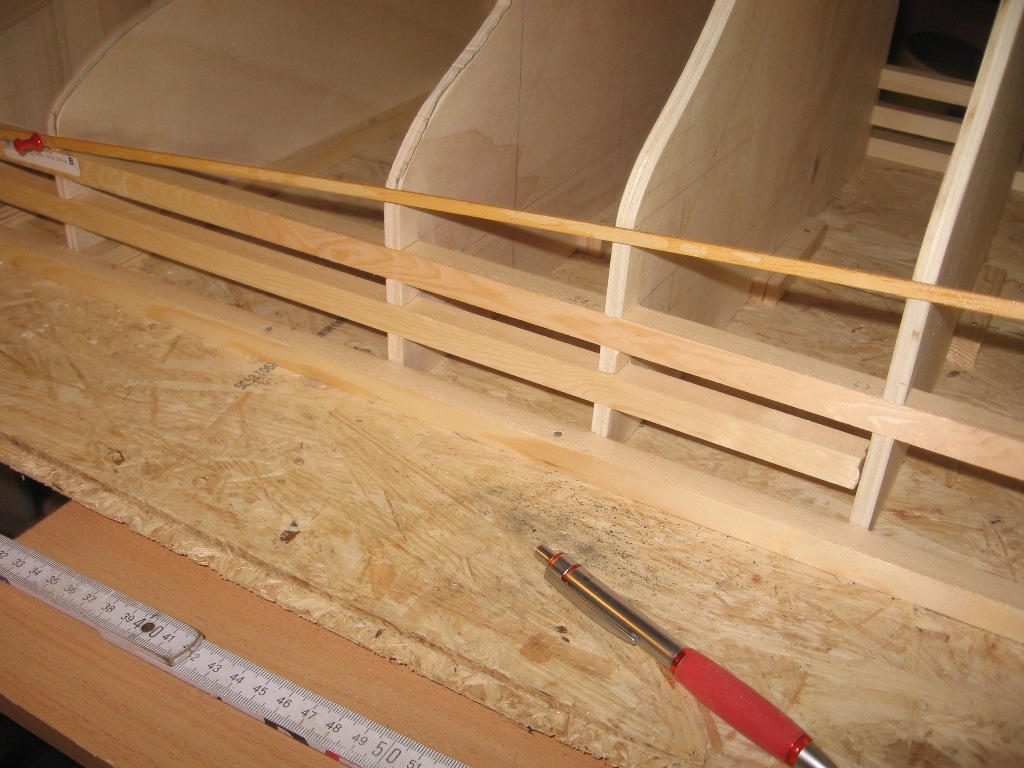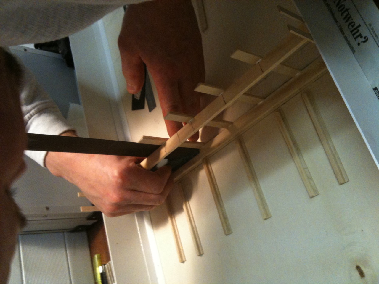 Dank Egon haben wir jetzt auch mehr Stringer eingebaut damit das Modell uns hinterher nicht verdreht. Alle Spanten haben wir jetzt ausgerichtet und die Stringer eingesetzt.