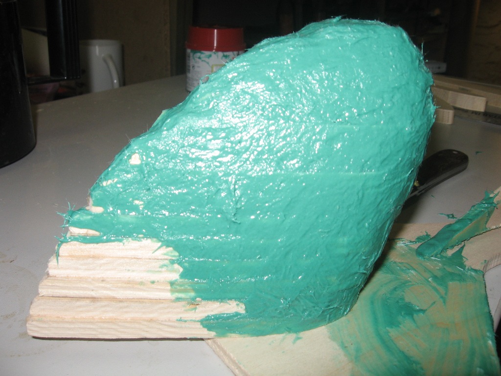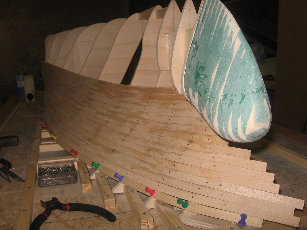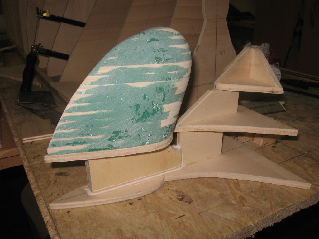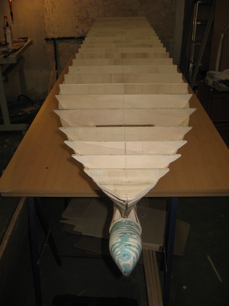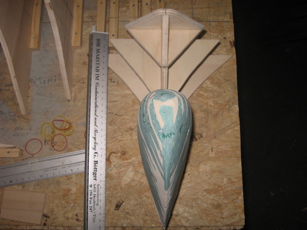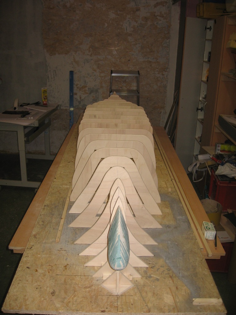 Alle ausgeschnitten und angefangen die Nase zu kleben. Als alle Spanten an Ort und Stelle waren haben wir das ganze mit Spachtel überzogen um die Lücken zu schließen und um eine bessere Grundlage zum Schleifen zu bekommen.