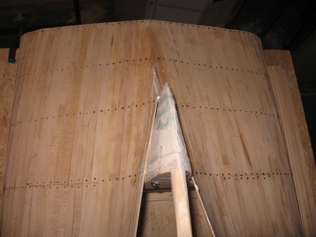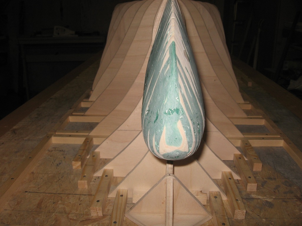 Der Bugbereich ist verstärkt und gut verklebt. Morgen kommt der nächste Step für die Spanten in der Mitte.